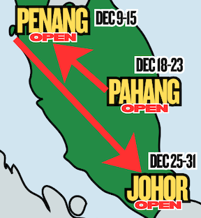 Between Pahang and Penang: 2-day gap (Dec 16-17) for travel and rest.